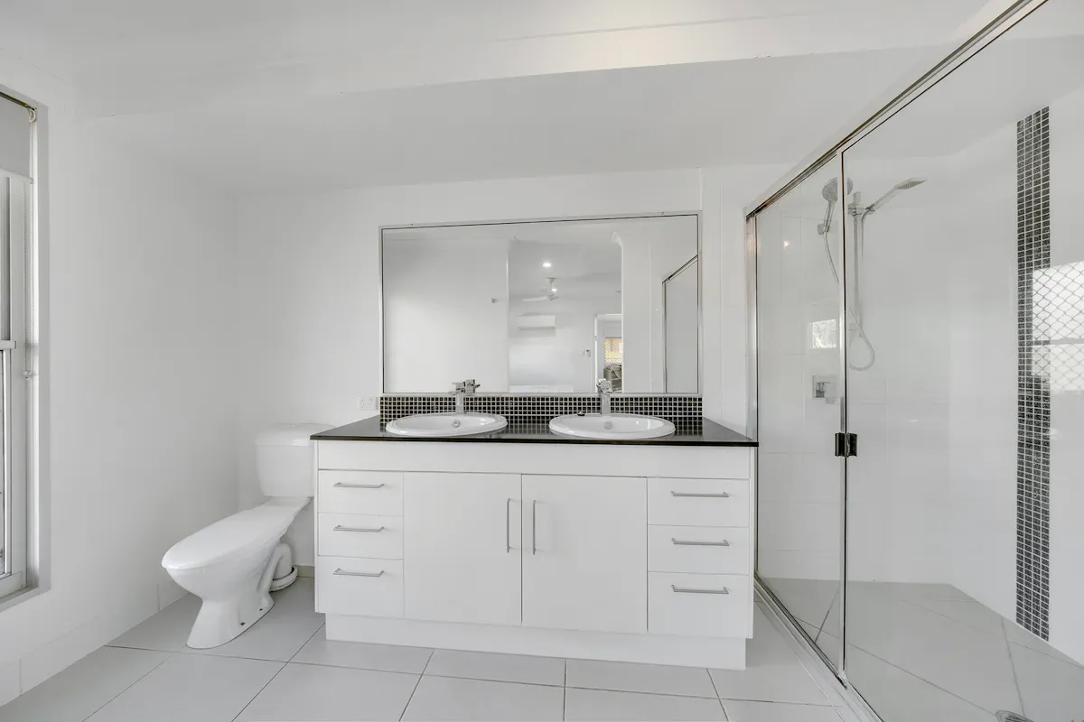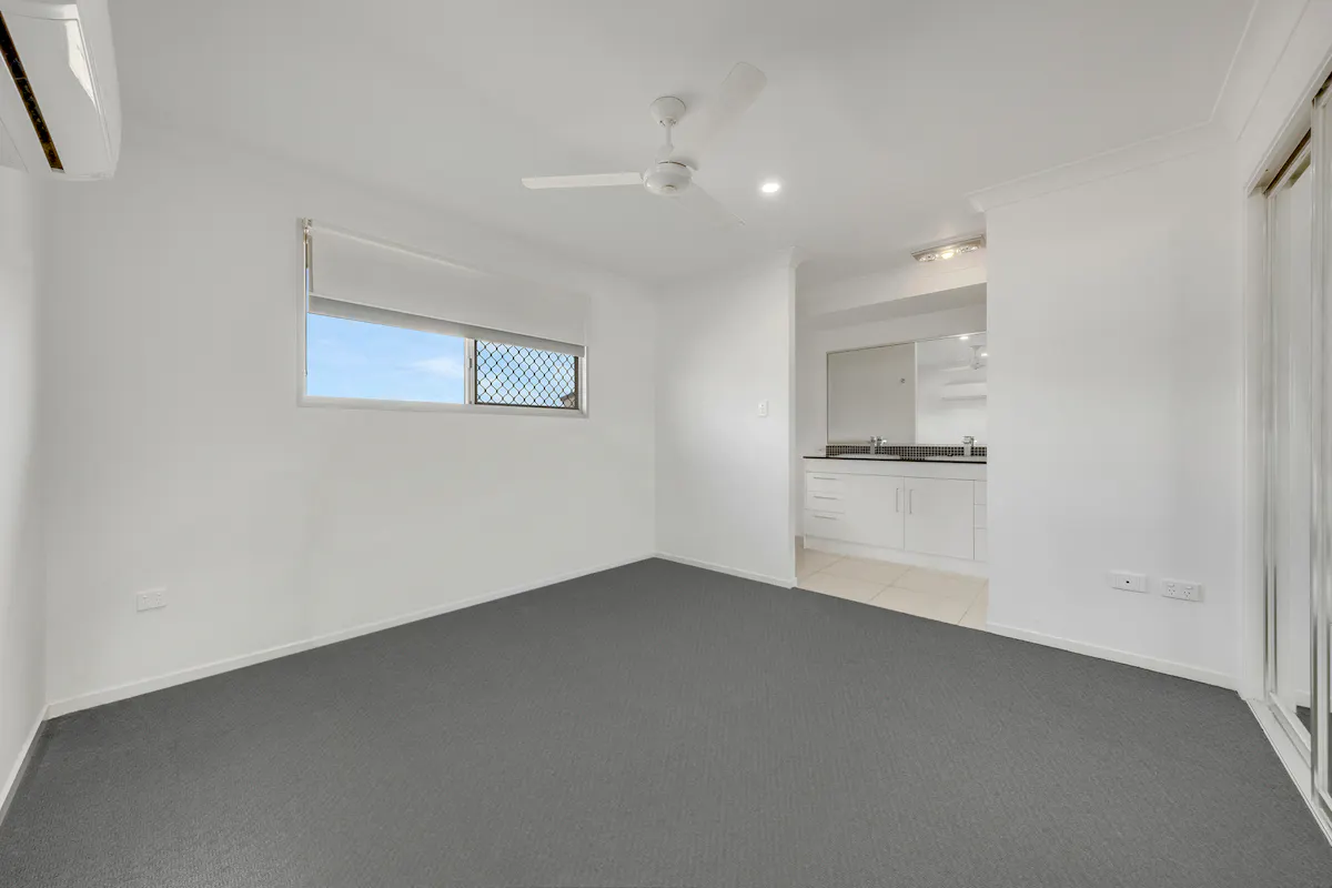 The home boasts generously sized, carpeted bedrooms complete with ceiling fans, built‑in storage and split‑system air conditioning. The master suite is privately positioned and features a walk‑through robe and a stylish ensuite with double vanity. The main bathroom is modern and family‑friendly, offering a separate shower, bathtub and toilet.
