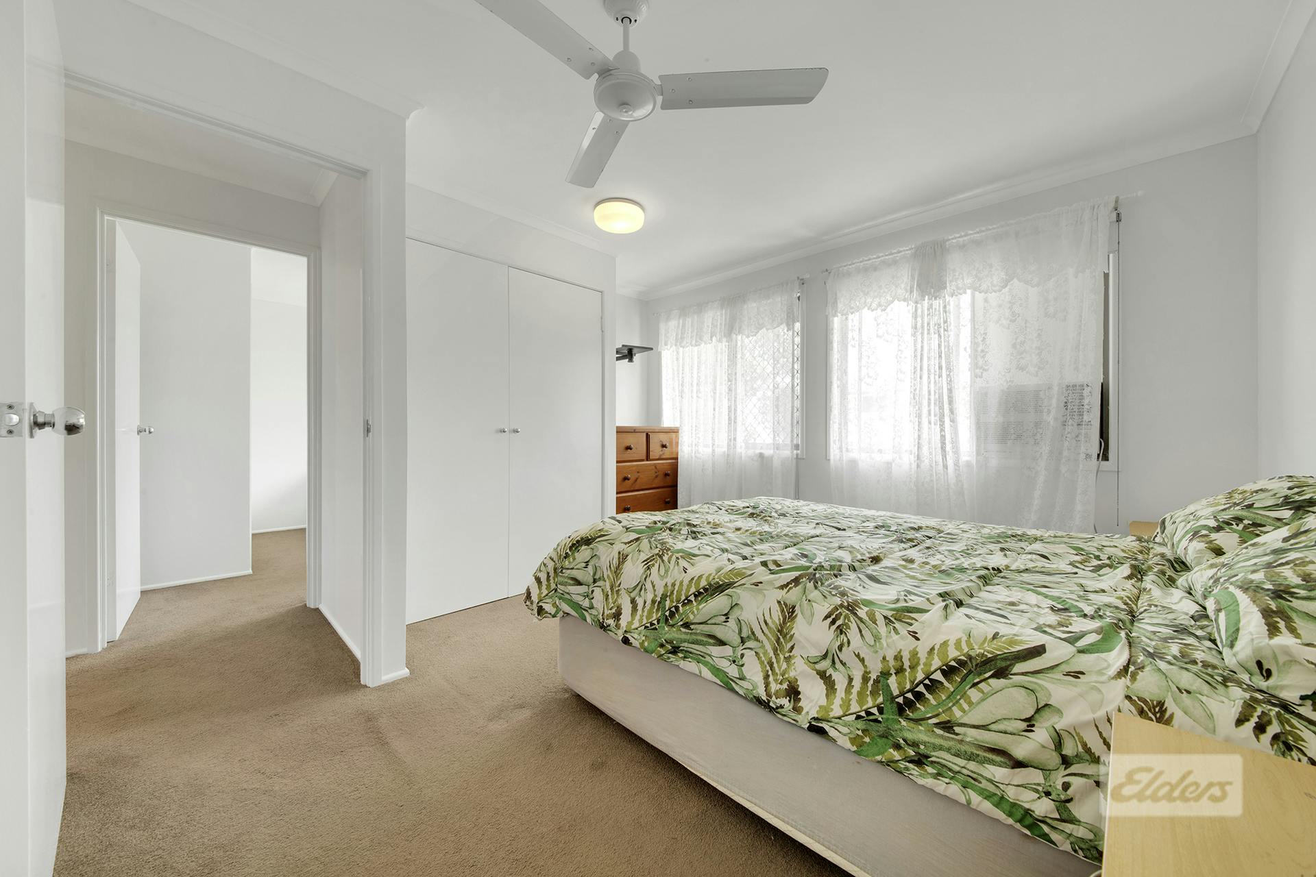 Two bedrooms with built-in robes, ceiling fans, and plush carpets