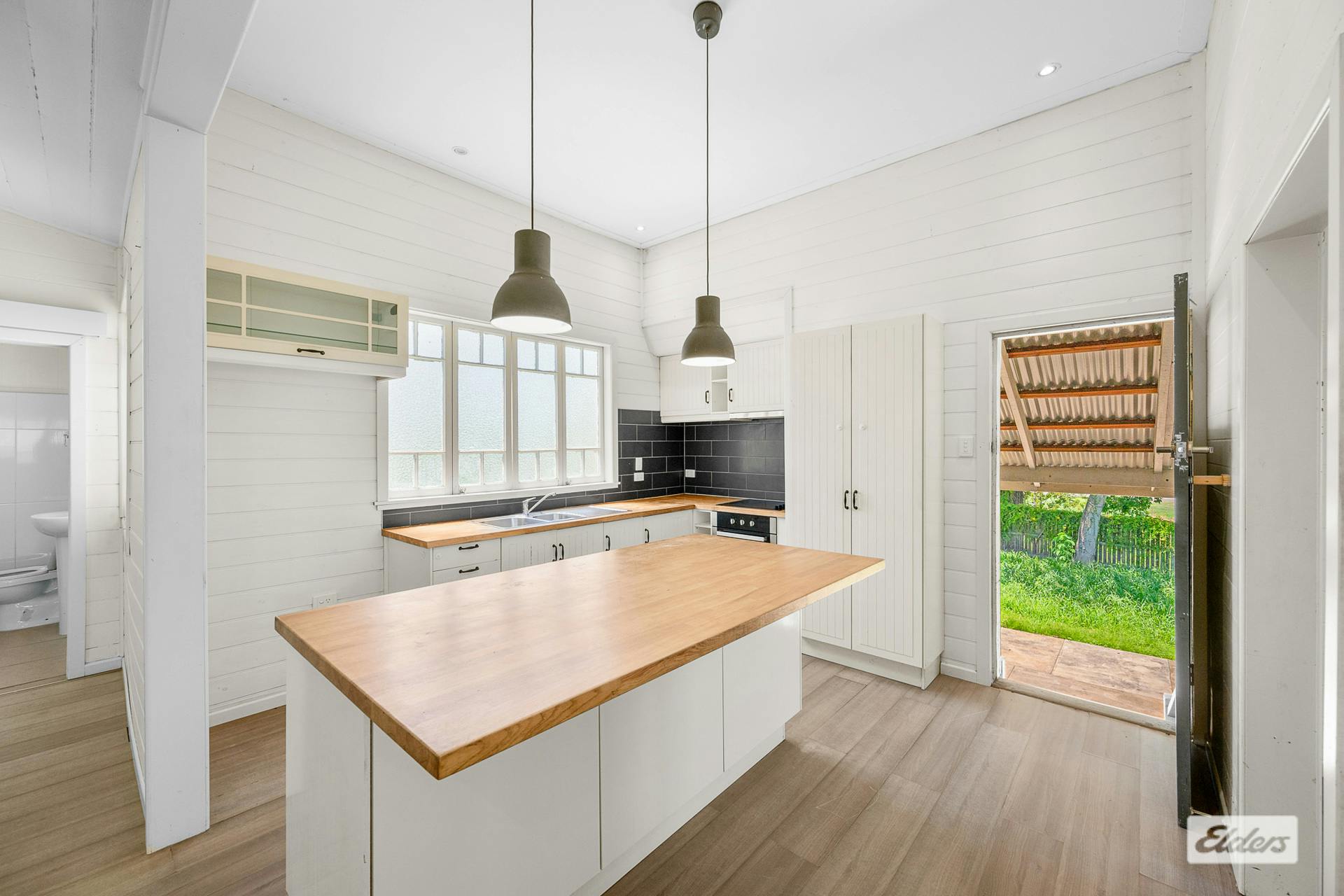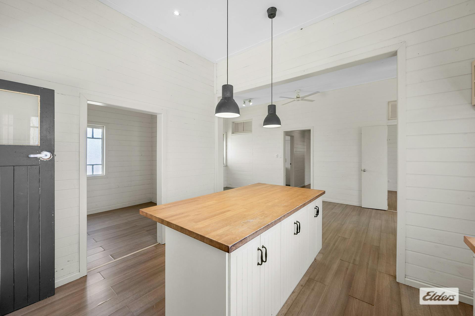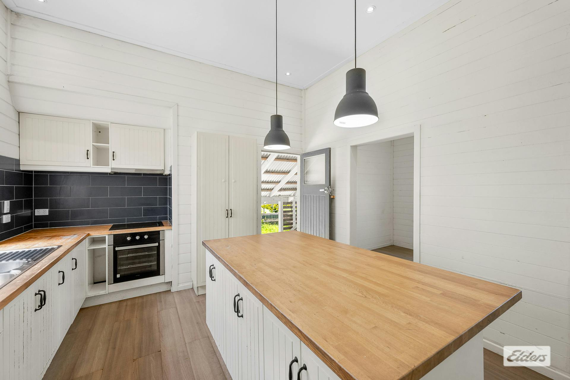 Family living is catered to with a spacious open-plan kitchen, dining, and living area, where vinyl planking . The kitchen is a culinary haven, equipped with a cooktop, under-bench oven, ample pantry space, overhead cabinets, and a central island breakfast bar adorned with butcher block tops – perfect for casual dining or morning coffees. A dedicated study off the kitchen ensures a quiet spot for work or study.